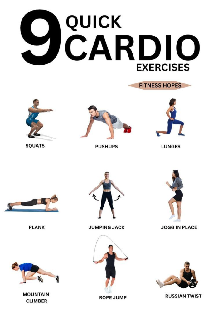 Cardio exercise short for cardiovascular includes any physical activity that increases your heart rate and breathing for a sustained period of time. It strengthens the heart, lungs, and circulatory system. You can do brisk walking, jogging, cycling, or swimming. Aim for at least 150 minutes of moderate or 75 minutes of vigorous-intensity exercise per week.