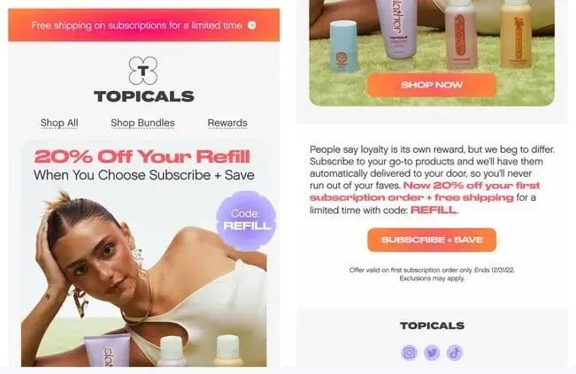”Topicals” a skincare company, uses email marketing as part of a digital marketing strategy. The image below displays a marketing email that advertises a subscribe and save deal, where people get 20% off refills if they choose to subscribe.