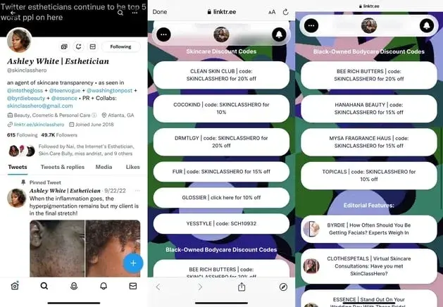 Ashley White is an esthetician who uses affiliate marketing. In her X profile, she includes a link to a personal Linktree page where she shares referral codes and discounts for people who shop with her codes and links.