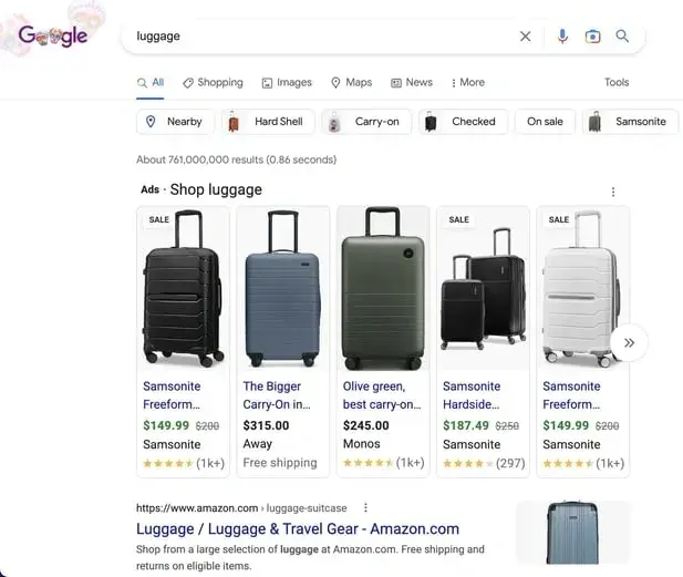 The image below is an example from Samsonite , where a query for the word “luggage” surfaces various luggage options from known brands that have created ads to feature their products front and center in search results.
